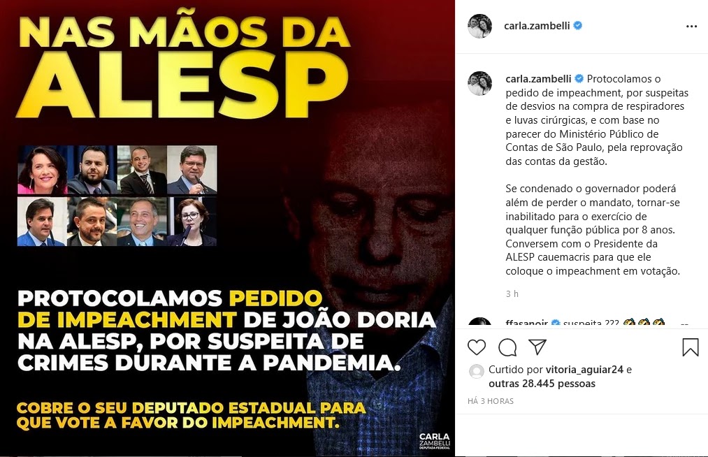 Acaba de ser protocolado na Câmara de São Paulo ( Alesp) o pedido de impeachment de João Doria e desta vez os deputados, dizem que não dará mais chances para o governador de SP se explicar pelas irregularidades na administração do dinheiro enviado pelo governo federal para combate a COVID-19.